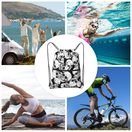 Halloween Goth Skull Drawstring Backpack, Gothic Black White Skeleton Drawstring Bag, Waterproof Durable String Sackpack, Large Capacity Cinch Sackpack for Yoga Sport Beach Gym Shopping