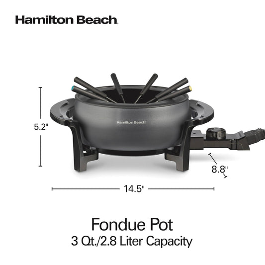 Hamilton Beach 12 Cup Electric Fondue Pot Set with Temperature Control, 6-Color Coded Forks, for Cheese, Chocolate, Hot Oil, Broth, 3 Quart PFAS-Free Nonstick Interior, Gray (86202)