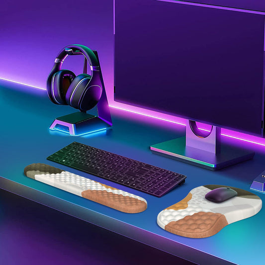 HAOCOO Ergonomic Mouse Pad with Wrist Rest and Keyboard Wrist Rest, 3 PCS Computer Carpal Tunnel Mouse Pads for Desk with Coaster Set, Memory Foam Keyboard Wrist Support for Laptop Office, Boho Beige