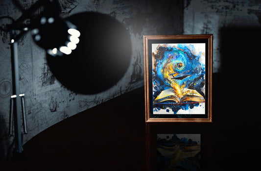 7Dots Art. Book with a story emerging from its pages. Wall Art (8 in by 10 in) - UNFRAMED. Art Print on Fine Art thick Watercolor (aquarelle) paper for book lovers, bookworms, bibliophiles, and book readers. Wall decor, poster. (space ship)