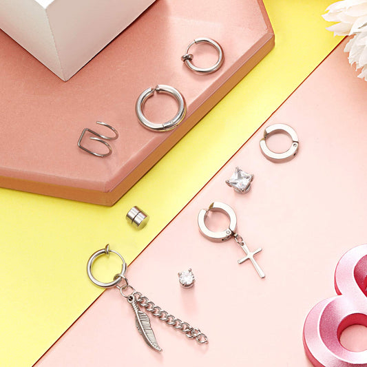 Hicarer 9 Pairs Magnetic Stud Earrings Non Pierced Silver Stainless Steel Feather Dangle Earrings for Women and Men, stainless steel, cubic zirconia