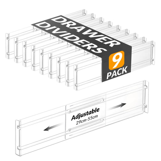 Hormes Drawer Dividers, 9 Pack Adjustable Clear Drawer Organisers, Expandable 29–55cm and 8cm High Drawers Separators for Bedroom Clothing, Kitchen Utensils, Bathroom & Office Organization and Storage