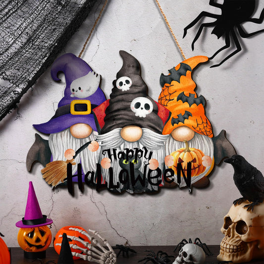 Huwena Halloween Welcome Door Sign Wood Vintage Rustic Hanging Decoration Halloween Horror Pattern Welcome Front Door Sign Wall Decoration for Indoor Outdoor Party(Gnome Style)