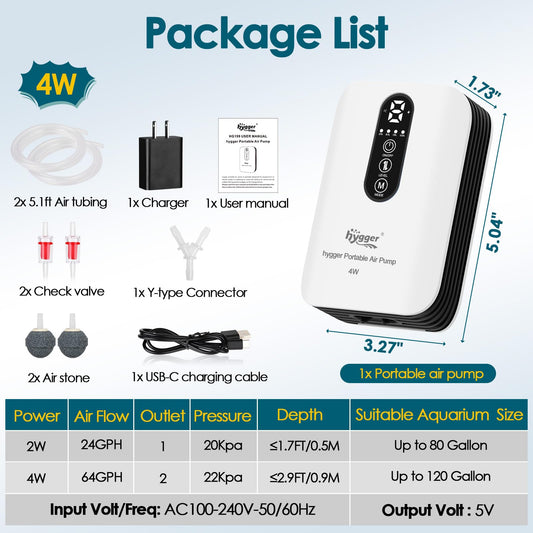 hygger Battery Powered Aquarium Air Pump 10-120Gal, Quiet USB Rechargeable Adjustable Fish Tank Air Pump, Portable Fish Oxygen Aerator Bubbler for Bait Bucket, Outdoor Fishing, Power Outage, Emergency