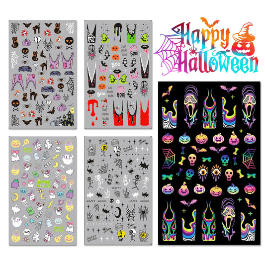 IDDFEVE Halloween Nail Art Stickers, Gradient Pumpkin, Horror Mask Nail Decals, 3D Self-Adhesive Spider-Web Bat Design for DIY Nail Supplies Decoration (5 Sheets)