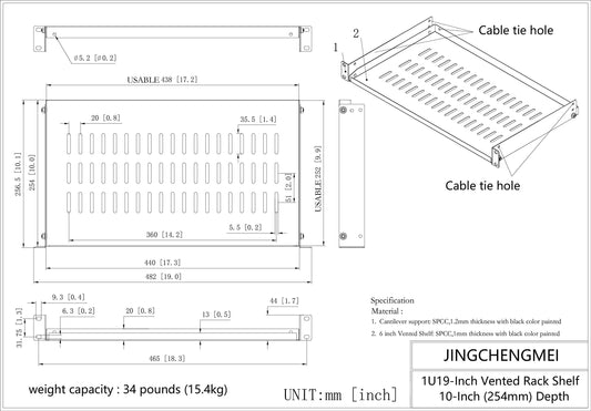 Jingchengmei 1U Disassembled Vented Cantilever Server Rack Mount Shelf 10"(254mm) Depth for 19-Inch Network/AV Equipment Rack and Cabinet(1U10V)