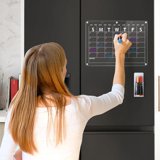 Acrylic Magnetic Dry Erase Board Calendar for Fridge, 16.5"x12" Inch Clear Dry Erase Calendar for Refrigerator, Magnetic Planning Calendar Includes 6 Colors Dry Erase Markers and Magnetic Pen Holder