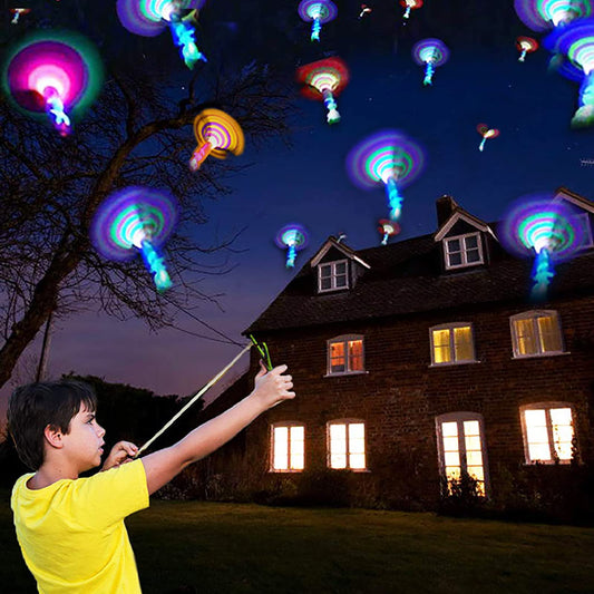 JX Rocket Slingshot Flying Toys with Led Lights,12Pcs LED Arrow Helicopters + 12Pcs Launchers,Summer Outdoor Game LED Slingshot Toy for Kids, Glow in The Dark Kids Party Supplies
