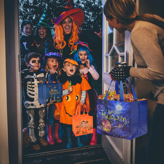 AhfuLife 12 Pcs Halloween Trick or Treat Bags, Candy Tote Bags with Handles, Reusable Non-Woven Gift Bag for Halloween Party Supplies Favors (7.8×7.8×5.9’’)