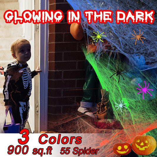 Ahuimeius 3 Colors 900 sqft Halloween Glow Spider Webs Indoor & Outdoor Spooky Spider Webbing with 55 Fake Spiders for Halloween Decorations, White, Green and Orange with Blacklight Lamp