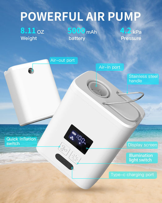 Air Pump for Inflatables Mini Air Mattress Pump Portable Electric Air Pump for Pool Floats,Swimming Rings, Sleeping Pads, Vacuum Storage Bags 5X with 5000mAh Battery & Light, USB Rechargeable