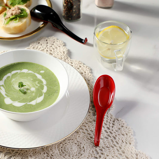 12 PACK Asian Soup Spoons, Rice Spoons, Melamine Chinese Won Ton Soup Spoon For soba, pho, ramen, Noodle, Korean Style Large Spoon with Long Handle- Notch and Hook Style, Red & Black