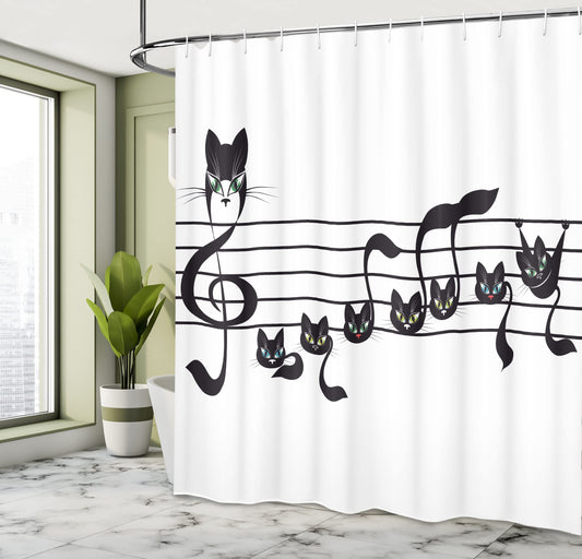 Ambesonne Music Shower Curtain, Notes of Kittens Kitty Cat Art Notation of Tune in Halloween Theme Monochrome Style of Artwork, Cloth Fabric Bathroom Set with Hooks, 69" W x 75" L, Cream and Black