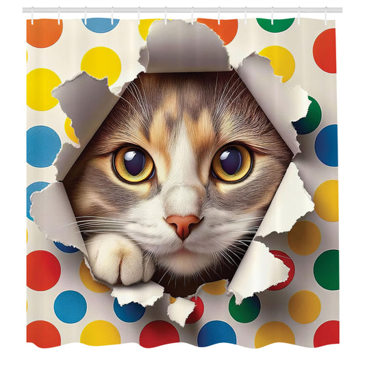 Ambesonne Cat Shower Curtain, Funny and Mischievous Kitty Peaking Through a Torn with Colorful Polka Dots Print, Cloth Fabric Bathroom Decor Set with Hooks, 69" W x 70" L, Multicolor