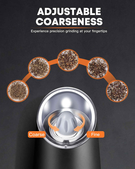 AmuseWit Gravity Electric Salt and Pepper Grinder Set of 2 [White Light] Battery Operated Automatic Pepper and Salt Mills with Light,Adjustable Coarseness,One Handed Operation,Black