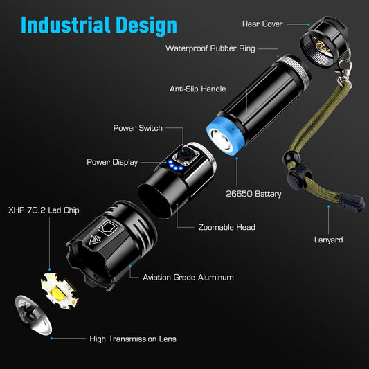 ANKRA 90000LM High Lumen Rechargeable LED Flashlight, High Lumens XHP70.2, 10 Modes Zoomable,Waterproof,USB Output Power Bank,Tactical Flashlight for Camping,Hiking,Emergencies (2-Pack)