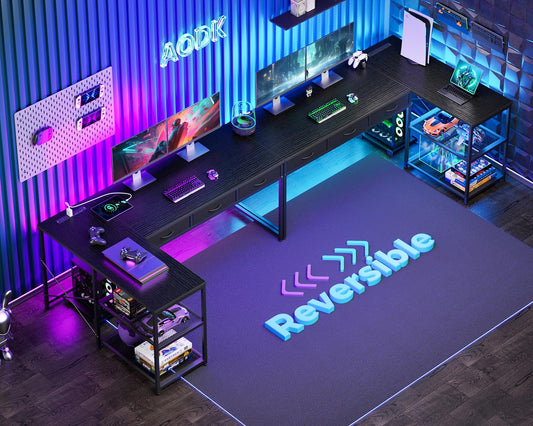 AODK L Shaped Desk Gaming Desk with LED Light & Power Outlet, 53 Inch Reversible L Shaped Computer Table with Shelf & Storage Bag & Hook for Home Office, Black