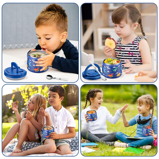 14oz Insulated Vacuum Food Jar with Buckle Lid,Soup Thermo for Hot Food Kids,Wide Mouth Leakproof Stainless Steel Lunch Container with Spoon-Dinosaur