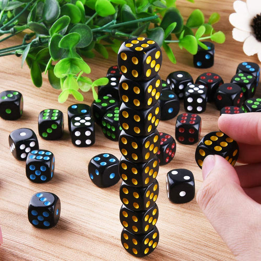 AUSTOR 100 Pieces Black Dice with Colorful Pips 6 Sided Rounded Corner Dice Set with a Storage Bag