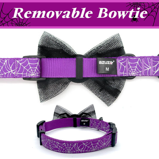 azuza Halloween Dog Collars with Bow Cute Sequined Spider Purple Dog Collar with Lace Bow tie Gifts on Halloween for Medium Dogs