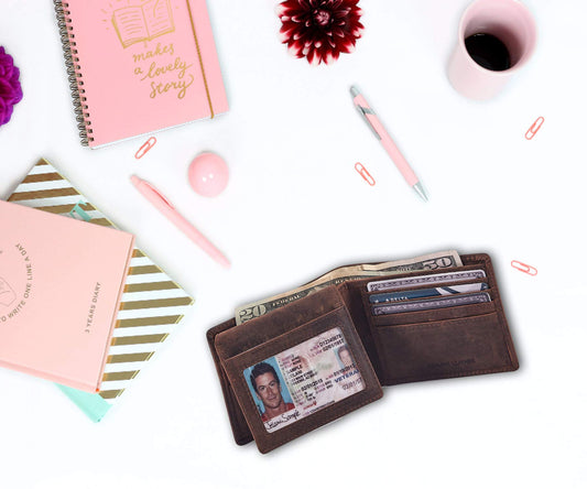 Bifold Wallet for Men's Real Genuine Slim Leather RFID Blocking 2 ID Windows Stylish Travel Gift Box (CRAZY HORSE, COGNAC)