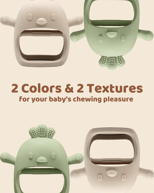 2 Packs Baby Teething Toy for 0-6 6-12 Months, Food Grade Silicone Teething Mitten, Anti Dropping Wrist Hand Teethers Baby Chew Toys for Sucking Needs, BPA Free (Green & Caramel)