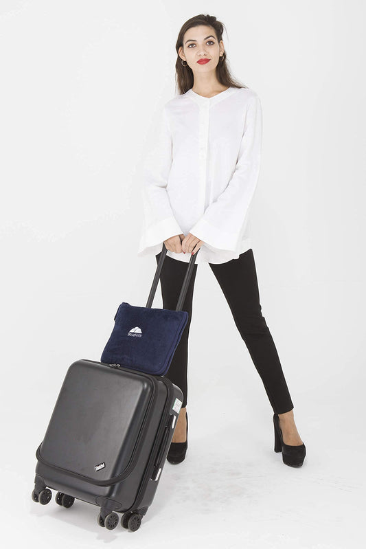 BlueHills Premium Soft Travel Blanket Pillow Airplane Blanket Packed in Soft Bag Pillowcase with Hand Luggage Belt Compact Pack Large Long Flight Essentials Portable Navy Blue T002