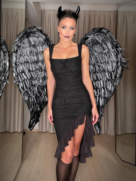 BORIFLORS Women's Sexy Ruched Bodycon Midi Dresses Square Neck Sleeveless Ruffle Hem Club Party Tank Dress, X-Small, Black