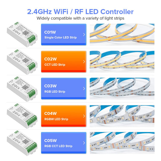 BTF-LIGHTING C01W Monochrome PWM (+V -V) 2PIN LED Strip Dim Brightness 2.4GHz Tuya WiFi Group Controller Alexa Google Home Smartphone APP Control Compatible with WR02RF RC01RFB Remote
