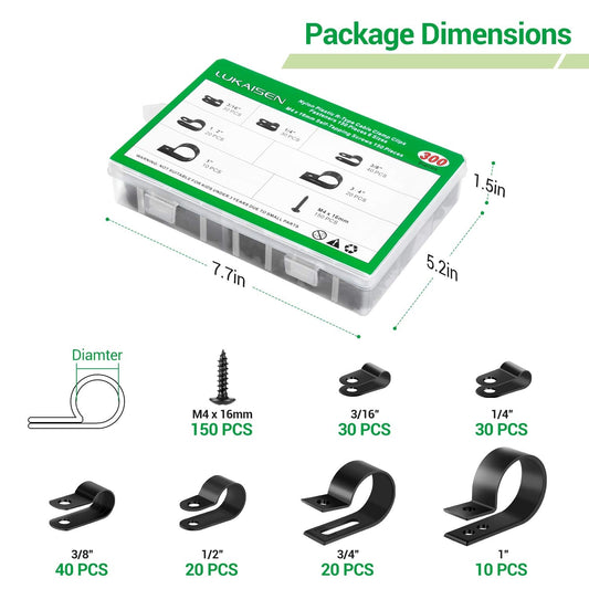 Cable Clips for Cable Management Cord Organizer, 6 Sizes 300 PCS Nylon R-Type, 3/16'' 1/4'' 3/8'' 1/2'' 3/4'' 1'' Black Plastic Screw Mounting Cord Fastener Clamp Assortment Kit with M4 Screws