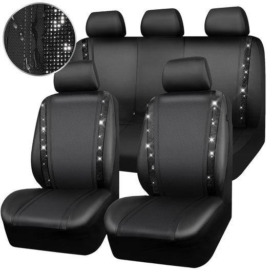 CAR PASS Leather Bling Diamond Car Seat Covers Full Set, Shining Rhinestone Waterproof Durable Rear with Zipper, Universal Fit Automotive Glitter Crystal Sparkle Strip for Cute Women Girly Black