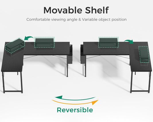 Casaottima L Shaped Computer Desk with Storage Bag, 57.5 Inch Reversible Gaming Table, Home Office Corner Desk with Monitor Shelf, Space-Saving Writing Workstation Desk, Easy to Assemble, Black