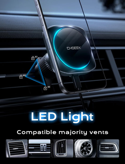 CHGeek for 15W Magsafe Car Mount Charger, iPhone Wireless Car Charger Magnetic Car Phone Holder Mount Fit iPhone 16 15 14 13 Magsafe Case, Vent/Windshield/Dash Phone Mount Holder Fast Cooling Charger