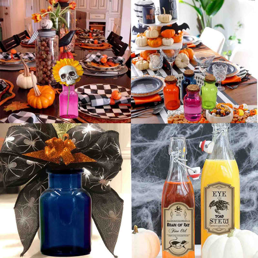 Cokaniy Halloween Glass Potion Bottle,4 Set of Apothecary Bottles with 8pcs Halloween labels Stickers,Colorful Glass Decorative Jar, Corked Bottle, Halloween Tiered Tray Decor Witchcraft Supplies