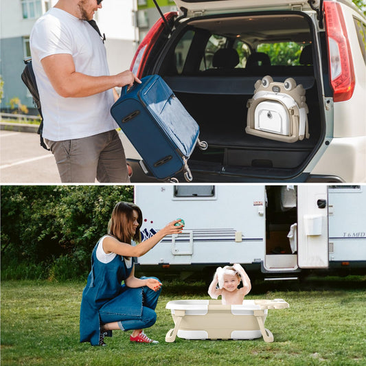 Collapsible Baby Bathtub for Infants to Toddler with Real-time Temp Monitor+Floating Cushion,Foldable Baby Bath Tub Set Applicable 0-36 Month,Portable Travel Baby Tub for Newborns Boy (Beige)