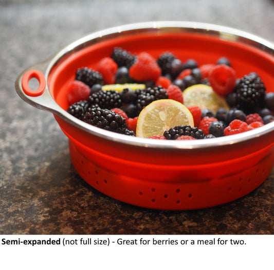 Collapsible Colander and Funnel - Stainless Steel Meets Red Silicone. RV Accessories for Inside, Camper Organization and Storage Idea, Motorhome, Camp or Travel Trailer, 5th Wheel, Boat, Small Kitchen