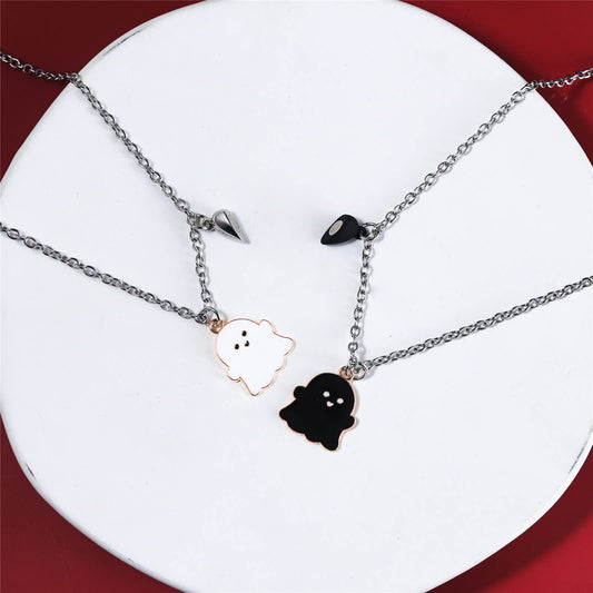 2Pcs Lovely Magnetic Love Heart Ghost Pendant Necklace Set for Women Men Friend Enamel Mutual Attract Magnet Couple Matching Necklace Halloween Jewelry Birthday Gift-A black white