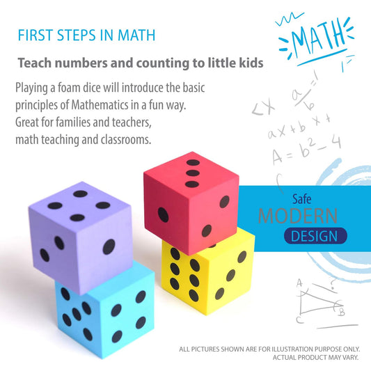 Deke Home - Foam Dice Set (Pack of 4), Big Dice for Classroom & Home Schooling, Assorted Bright Colors, Large 1.96 in, Lightweight, Quiet Play Toy, Math Games, Classrooms, Non-Toxic Materials