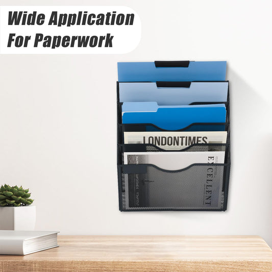 EASEPRES 5 Pocket Mesh Hanging Wall File Organizer, Wall Mounted Mail Paper Document Folder Holder, Clipboard Storage Organization Magazine Rack with Nametag Label for Office Home School, Black