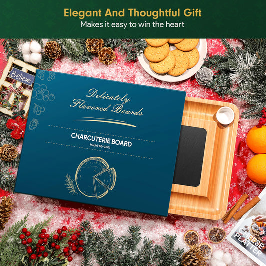Easoger Large Bamboo Charcuterie Boards, Cheese Platter with 2 Drawers, Serving Knife, 2 Ceramic Bowl - Unique Housewarming, Wedding and Bridal Gift
