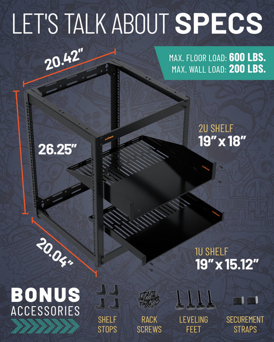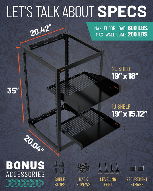 ECHOGEAR 20U Open Frame Rack for Servers & AV Gear - Wall Mountable Design Includes 2X Vented Shelves, 25x Rack Mounting Screws, 4X Leveling Feet, 4X Shelf Stops, & 2X Securement Straps