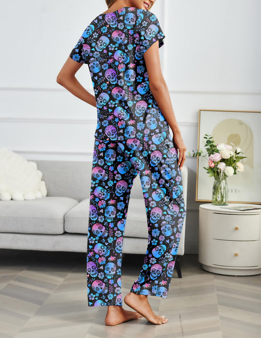 Ekouaer 2 Pack Pajamas for Women Set Short Sleeve Sleepwear Top and Pants Pjs Soft Printed Lounge Sets with Pockets Skull/Halloween XX-Large
