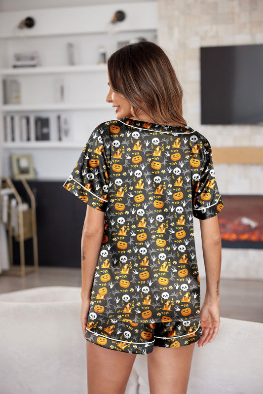 Ekouaer Silk Pajama for Women Short Sleeve Satin Pj Set Two Piece Soft Sleepwear Loungewear, Black Pumpkin & Spider Web, M