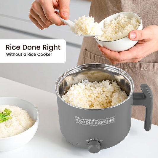 Elite Gourmet NOODLE EXPRESS™ Hot Pot, Prepare Ramen, Rice, Soups, Stews, Boil Water, Stainless-Steel Interior, Glass Lid, High/Low/Off Settings, Grey