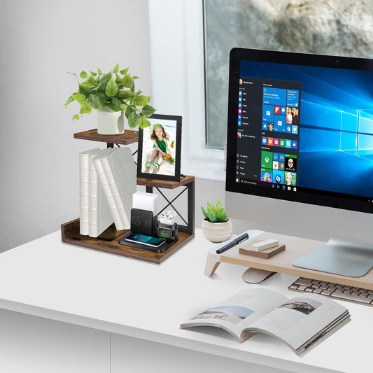 ELITEROO Desk Shelf Organizer, Wood Desktop Organizer Small Bookshelf, 3 Tier Storage Shelf Riser Display Stand for Office Decor and Desk Accessories, Rustic Brown Black
