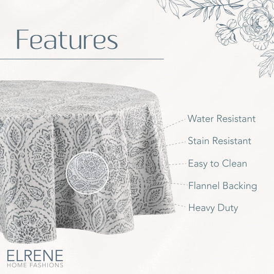 Elrene Home Fashions Savannah Boho Paisley Water- and Stain-Resistant Vinyl Tablecloth with Flannel Backing, 70 Inches X 70 Inches, Round, Gray