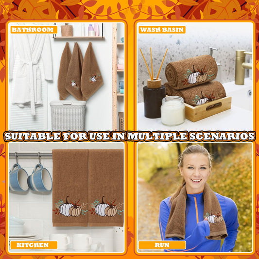 Fanfanwin 3 Pcs Fall Hand Towels for Bathroom 13.8 x 29.5 Inch Autumn Decorative Bath Towels Sets 100% Cotton Embroidered Pumpkin Maple Thanksgiving Bathroom Decor(Khaki,Pumpkin)