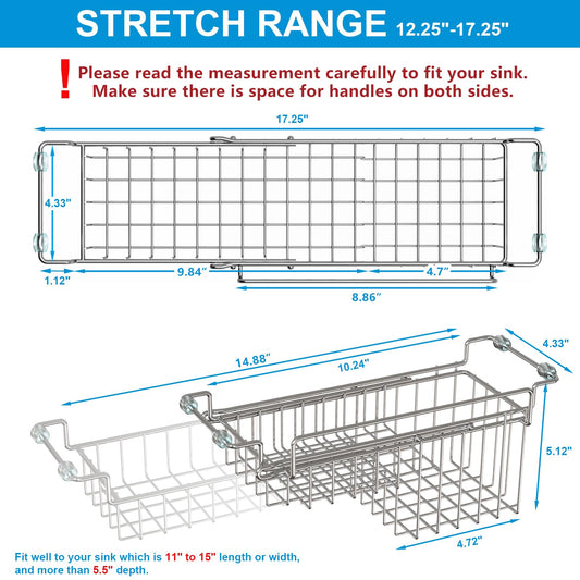 FavoThings Over The Kitchen Sink Caddy Sponge Holder Organizer Drying Rack Expandable for Sponge Brush Soap Dish Cloth Rag, Stainless Steel (12.25" to 17.25")