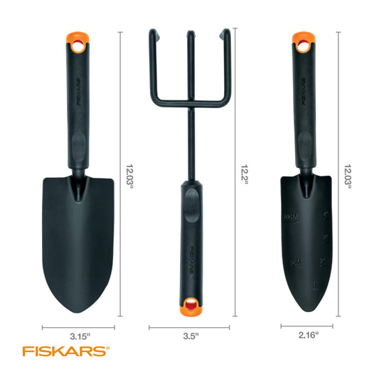 Fiskars 3-Piece Garden Tool Set - Trowel, Transplanter, Cultivator, Rust-Resistant Steel Heads, Ergonomic Handles for Planting, Digging, and Aerating Soil