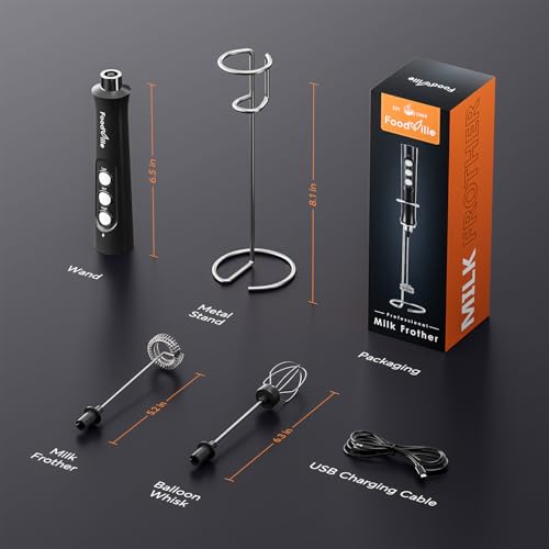FoodVille MF02 Rechargeable Milk Frother Handheld Foam Maker with Stainless Whisk for Cappuccino, Latte, Bulletproof Coffee, Keto Diet, Protein Powder, Matcha